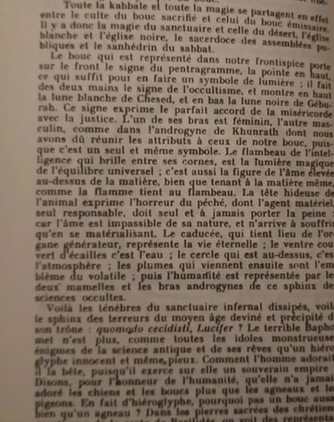 Il distingue en effet (page 323) entre le diable comme « agent », qui est « la Lumière astrale, corrélation des forces physiques et synthèse des forces hyperphysiques du cosmos », et le diable comme « »Esprit de perversité (…) le type abstrait et la synthèse idéale des Intelligences et Volontés, incarnées ou non, qui se prévalent des forces hyperphysiques, vers un but d’égoïsme à satisfaire ou de crime à perpétrer ». Mais là encore, Satan est un symbole abstrait et non un être doué d’une existence personnelle.