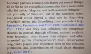 Les auteurs de The Invention of Satanism citent encore (ibid.) un membre de l'administration pénitentiaire américaine, qui, lors du procès d'un détenu sataniste, donc, j'imagine, sous serment, a soutenu que la Bible de Satan incitait à "tuer, violer, voler à volonté, sans regard pour les conséquences morales et légales", sans que la cour ait cru utile de vérifier ses dires. Ou encore un membre des forces de l'ordre qui déclare à la presse que des mutilations de bétail dans sa juridiction correspondent à des passages de ce même livre. Alors que la Bible de Satan condamne explicitement le meurtre, le vol et le viol, et qu'elle ne comporte aucune description de mutilations de bétail, comme n'importe qui l'ayant vraiment lue, par exemple moi, pourra le confirmer. Ils relatent aussi le témoignage très révélateur d'un prêtre, donné lors d'un "séminaire sur les crimes sataniques", qui avait vu un jeune jeter ce même livre sur ce bureau, et en avait tellement eu peur qu'il n'avait même pas osé le toucher, a fortiori le lire.