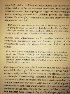 [...]The methods used by forensic investigators to elicit stories of abuse from the children were taken straight from the ritual abuse panic playbook. University of Texas at El Paso psychologist James Wood, who has written about the suggestive interviewing techniques used in the McMartin trial, for a 1993 episode of American Justice viewed videos of investigators from the Travis County Sheriff’s Department interviewing the young children who made claims against the Kellers." (Slate, "The real victims of satanic ritual abuse").