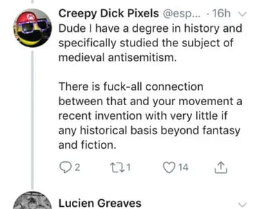 De façon similaire, ce n’est pas parce que l’accusation de satanisme, en Occident, a souvent été utilisée à tort pour persécuter de nombreux groupes que nous pouvons , en tant que satanistes, prétendre hériter d’une histoire de persécutions comparable à celle des Juifs.
