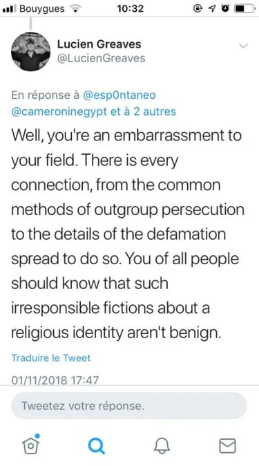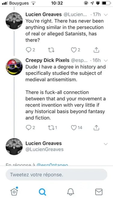Avertissement : cet article est une traduction, à des fins de références futures, de quelques chose que j’ai publié aujourd’hui sur divers réseaux sociaux puis repris sur mon blog anglophone, et non un contenu original. J’écrirai peut-être très prochainement un billet beaucoup plus développé concernant ce que je pense actuellement de The Satanic Temple et de Lucien Greaves. Je réagissais aujourd’hui à l’échange de tweets ci-dessous (selon moi fort malheureux), relatif aux allégations portées par TST contre Netflix et la série The Chilling Adventures of Sabrina :